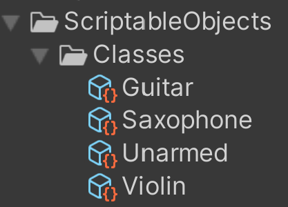 In the game, there are four distinct states: unarmed, guitar, saxophone, and violin. As you can see on the right, I created four distinct Scriptable Objects to denote these states that hold their specific values and prefabs. Originally, we designed the game under the idea that these states would be inherent classes that players would choose at the start of a match. Every class would mean not only a specific visual instrument, but also a different base and special attack for each option. However, entering development in the Fall, we iterated on our design to instead have instruments become pickups. If a player "died", they would lose their instrument and enter the vulerable unarmed state. This meant that players would need to be able to change their held instrument, scripts, and animator on the fly frequently throughout the game. Luckily, I had already accounted for this in the Spring.