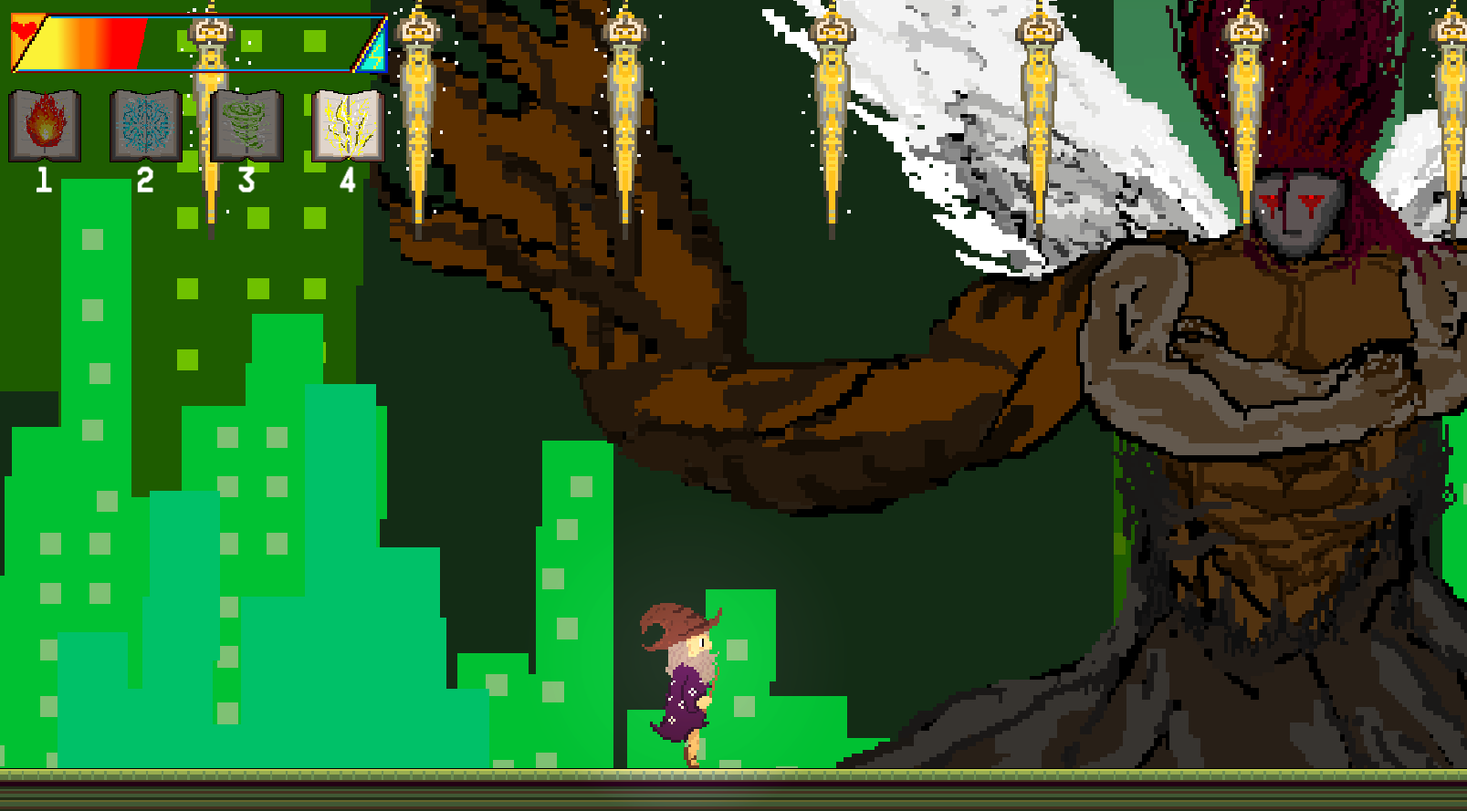 It's this question that drove the games design since the initial pitch. What if, depending on which spell the player initally picks, the game plays out differently? This raised a slew of questions right away. Would this be too much? With only six weeks, we had to scope appropriately and a core mechanic like this seemed like a stretch. Even if it was possible, how would it work? Design-wise, we iterated until we landed on an idea we were happy with. The wizard would initally fall into a large hub that contains paths to every "level" of the game. Every level has a special obstacle before it that can be thwarted by each of the spells. Think of it like each spell being a "key" to unlock one of the levels, and at the end of every level you recieve a new key (spell). Therefore, depending on which spell you choose, the order and natural flow of the game plays out differently for each choice. With that in mind, a new question arose in my head: how was I going to create the systems needed to allow for this level of flexibility?
